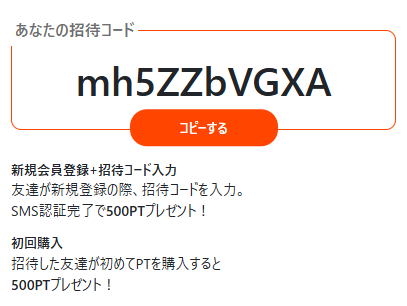 オリパナッツは招待コードの利用があると、招待者に最大1,000PTの付与がございます。(新規登録とSMS認証完了で500PT、初回課金で500PT)